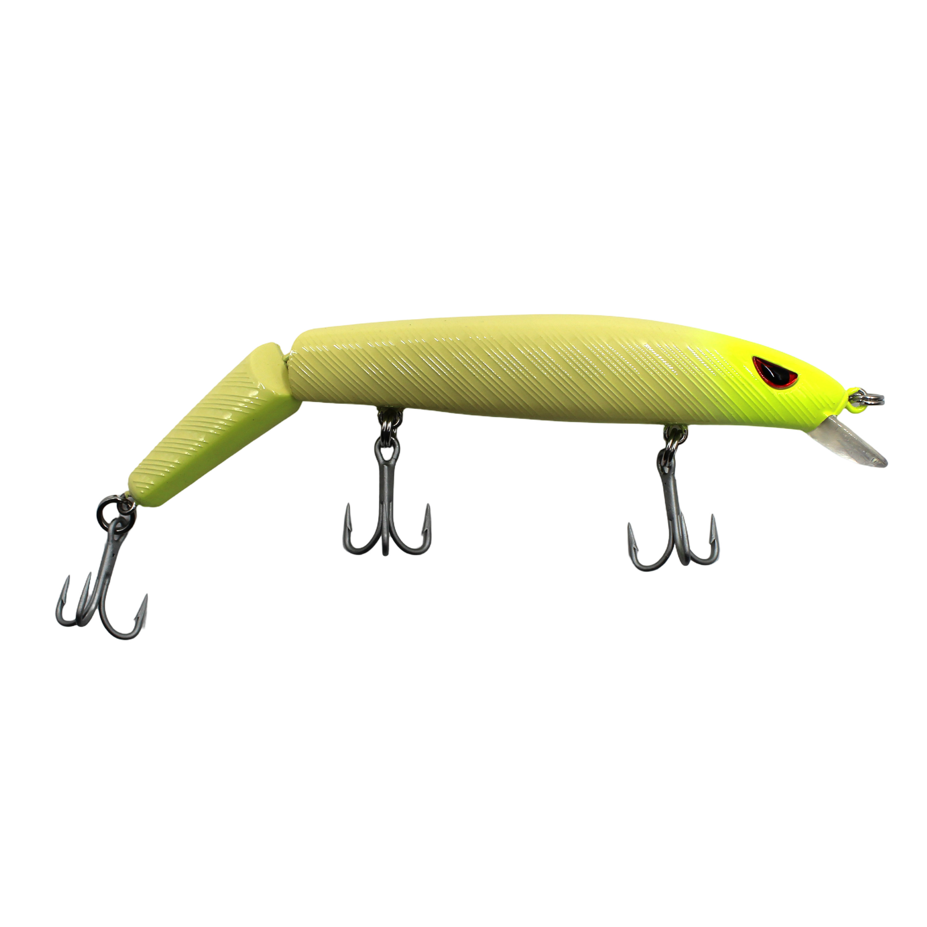 The Angry Eye Predator -Shallow Diving Jointed Minnow is a versatile 6 1/2 inch jointed minnow bait. If using for trolling the Angry Eye Predator will run at a depth range of 2-7 feet. You can also use the Angry Eye Predator with a slow retrieve and a high rod tip for bait on the surface. The jointed body deisgn ensures an erratic motion which allows the lure to really hunt for any species. With 3 counter balanced weights in the body and 6 hollow bb's in the center cavity, you can rest assured that you'll have the action and the vibration needed in any type of water conditions. Whether you're chasing huge snook, cagey lake trout or monster stiped bass, the Angry Eye Predator is a great choice.